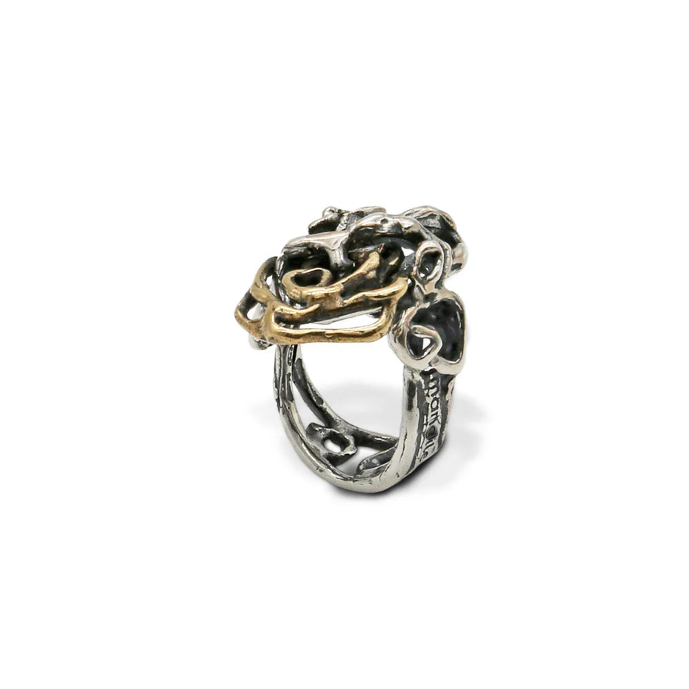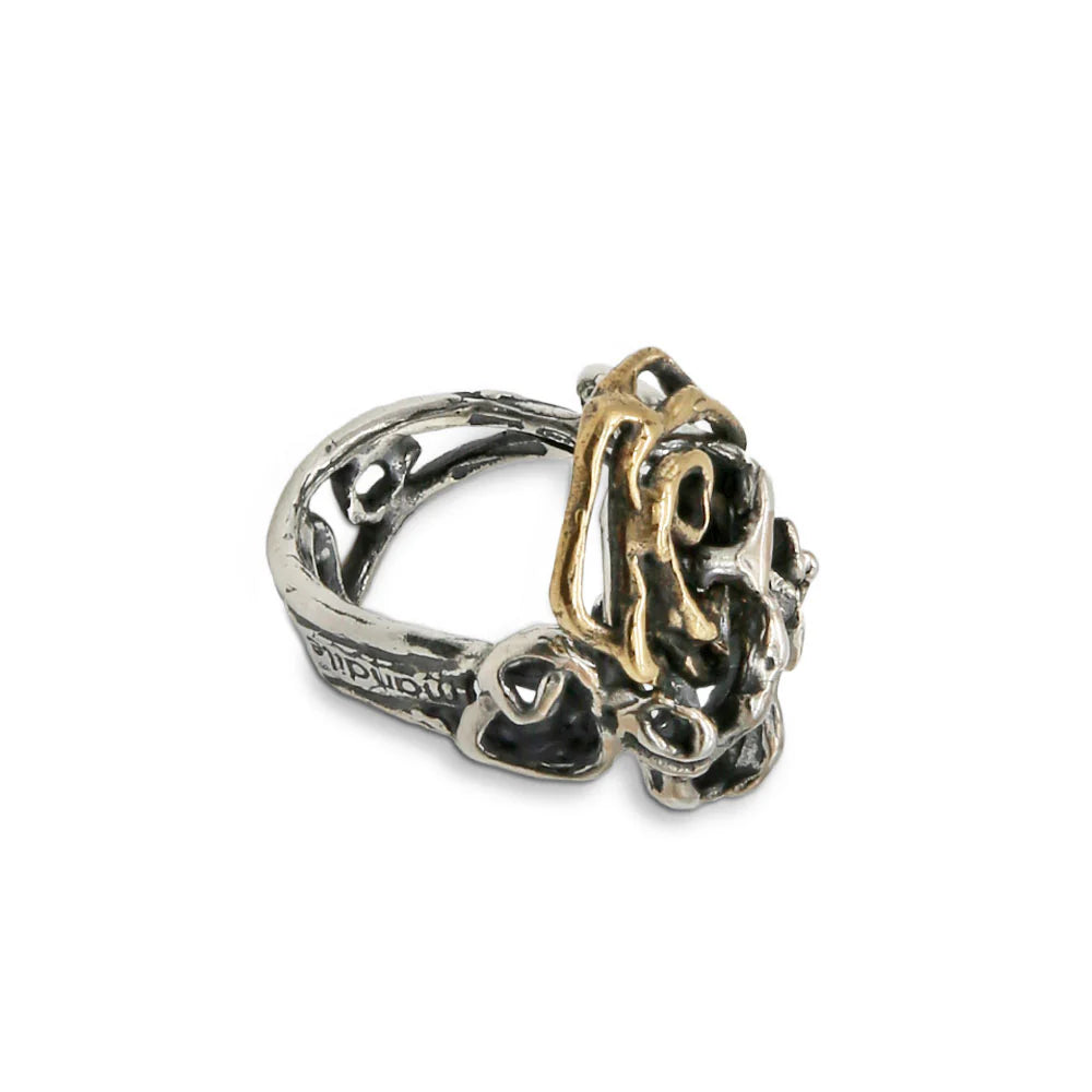 L'Anello Rose in argento 925 e bronzo è un gioiello artigianale che unisce eleganza e originalità. Il gambo dell'anello presenta un raffinato design: da un lato è inciso il logo, dall’altro un ricamo di fili d’argento che si fonde armoniosamente con una rosa stilizzata in argento posta sulla sommità. A questa si aggancia una seconda rosa, realizzata in bronzo con fili finemente intrecciati, leggermente mobile per donare un tocco dinamico e unico.