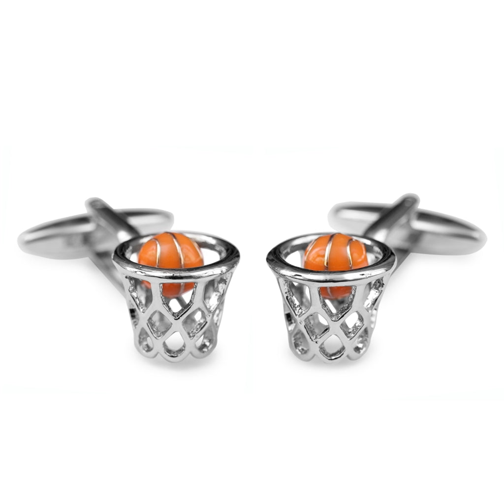 Articolo: gemelli da polso a forma di cesto e pala di pallacanestro smaltati in arancione.