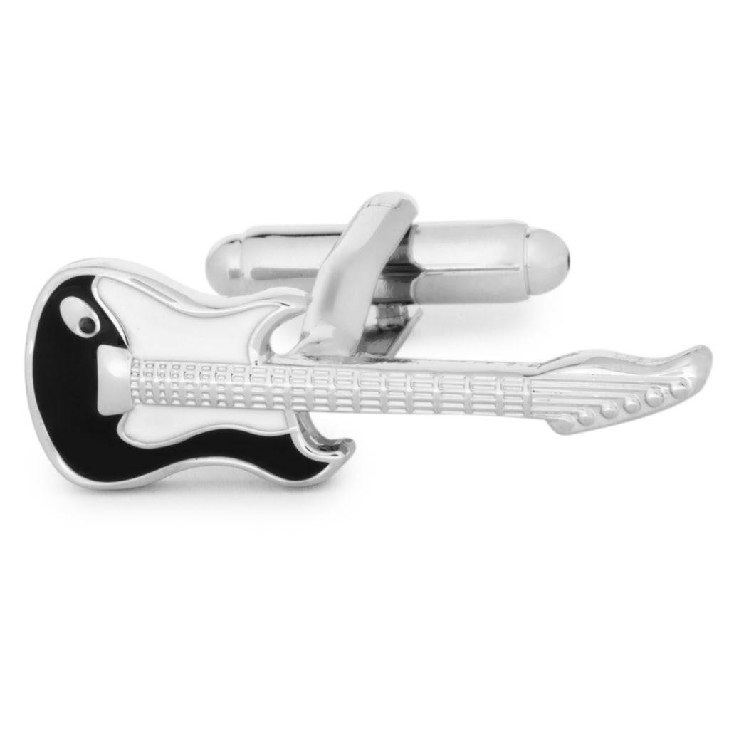 Gemelli da polso con forma di chitarra elettrica smaltati in nero e bianco.