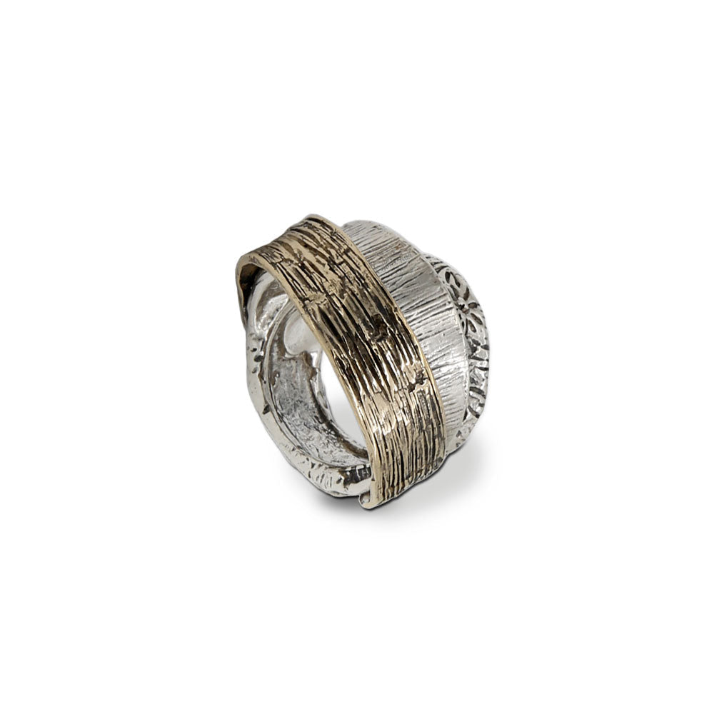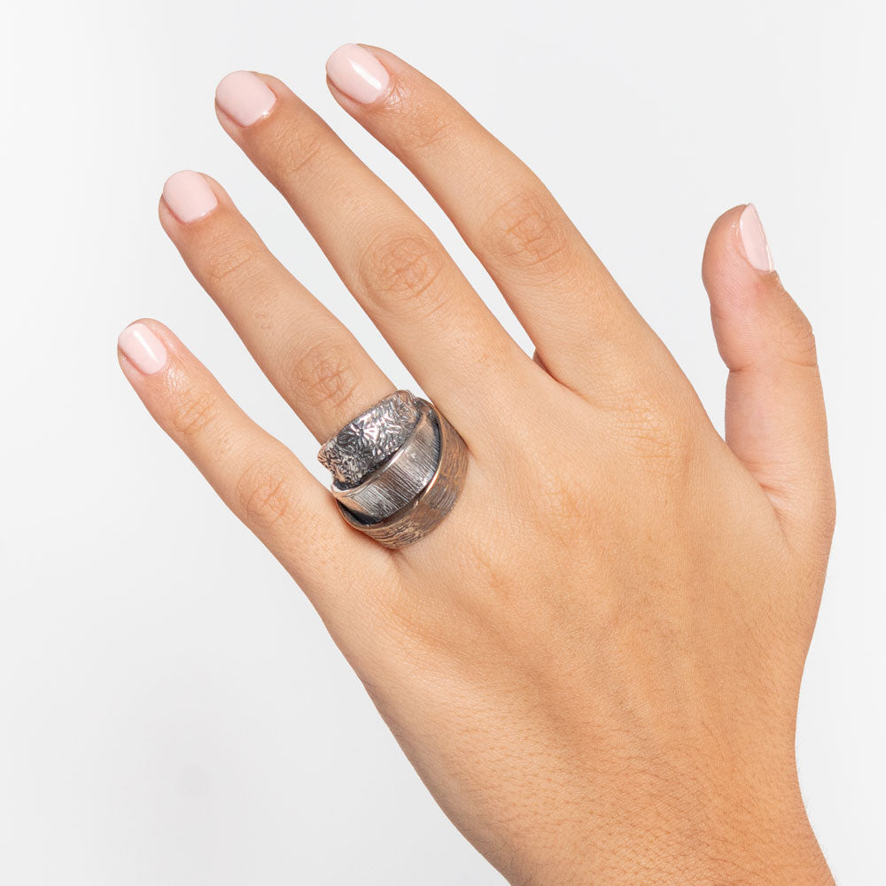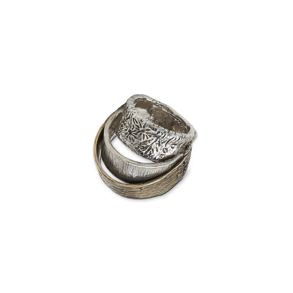 Dalla prima fascia in argento dell'anello Giardino segreto si innalzano le altre due una in argento e una in bronzo. Ogni fascia ha una decorazione diversa dall’altra, piccoli fiorellini stilizzati la prima in argento, effetto graffio verticale la seconda e quella in bronzo un effetto graffio orizzontale. Anello dalla forte personalità, il design contemporaneo e dinamico e di grande impatto visivo. Realizzato a mano in Italia.