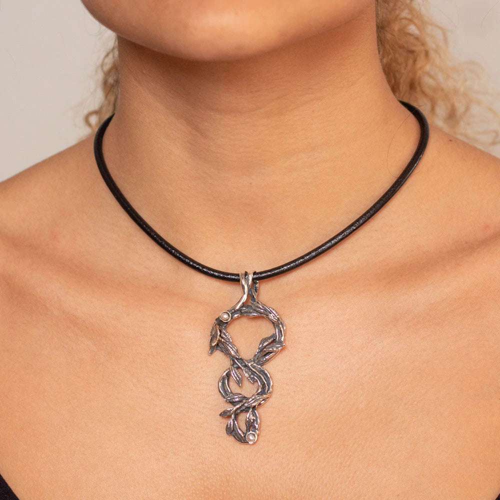 Due tralci di foglioline in argento 925 si incrociano a formare un otto, compongono il pendente arricchito da due piccoli granati cabochon la piccola fogliolina in bronzo per un delizioso contrasto cromatico. Perfetto per valorizzare con un tocco di raffinata eleganza il tuo look.
