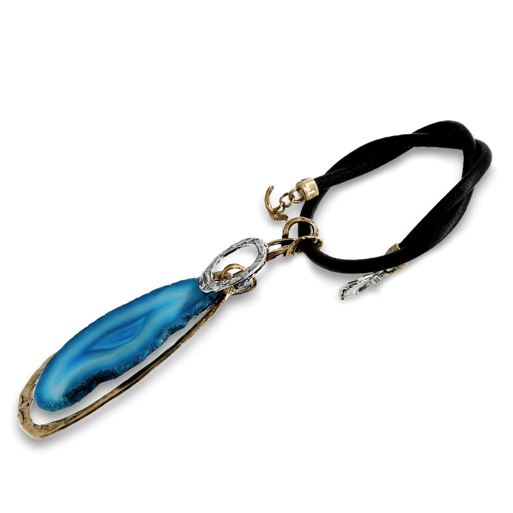 Pendente in argento 925 elemento in bronzo con agata multicolor, cordino in vero cuoio nero, chiusura artigianale T-BAR. La pietra è la protagonista assoluta di questo pendente dalle dimensioni importanti. Il metallo fa da cornice alla fetta di agata che è esaltata in tutta la sua bellezza, il cordino si aggancia al pendente per mezzo di un originale gancio che diventa anche un elemento decorativo. Un gioiello importante che arricchisce e completa l’outfit della donna con un gioco di luce e colore racchiusi in un gioiello che non passerà inosservato.