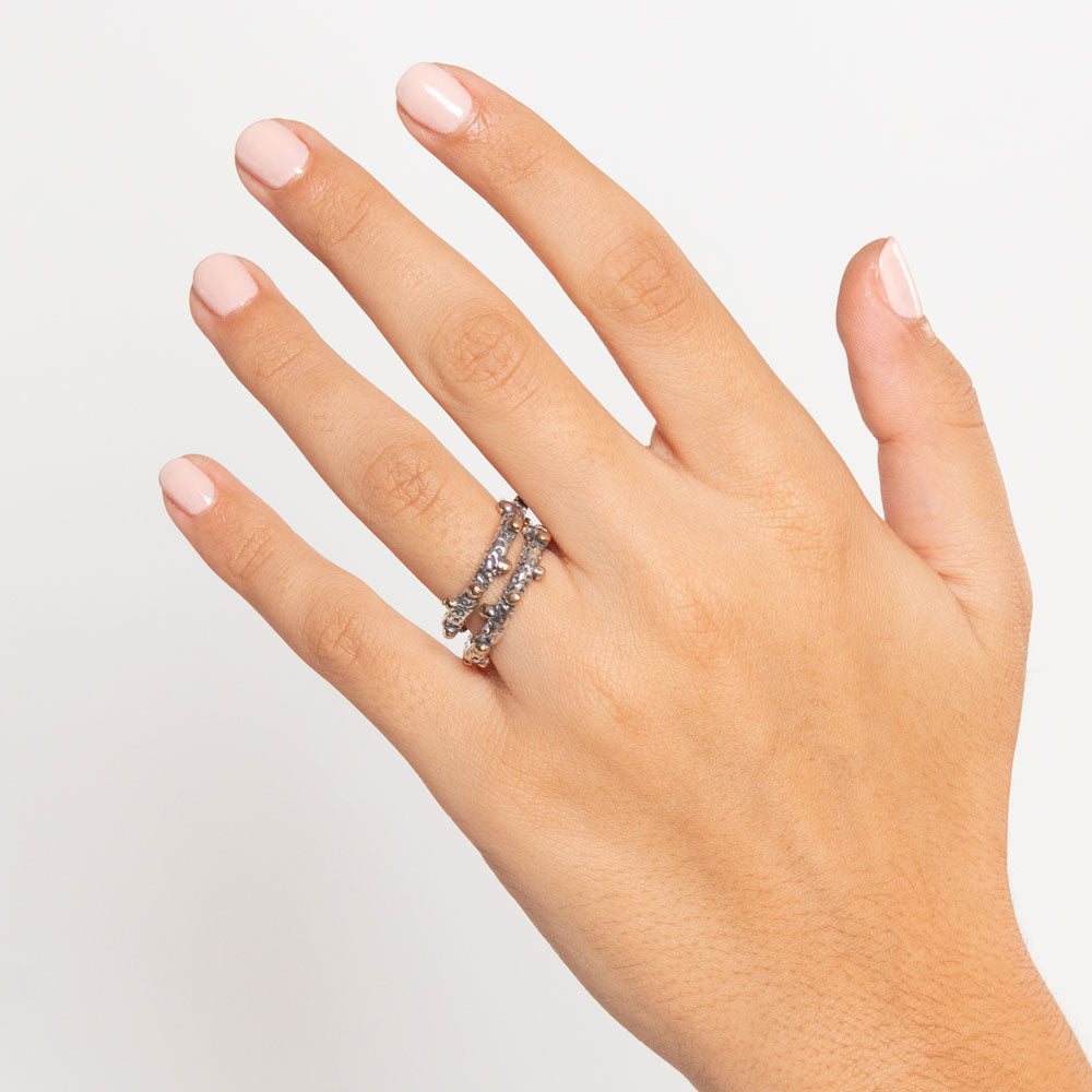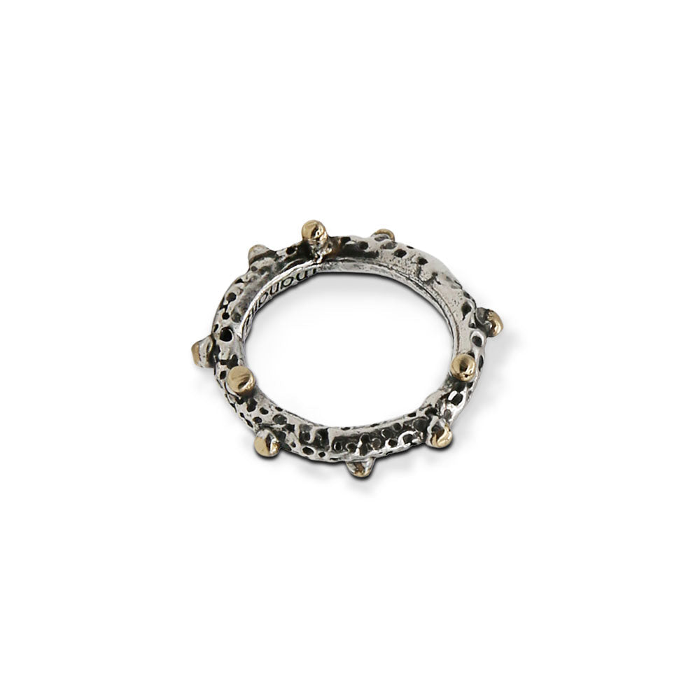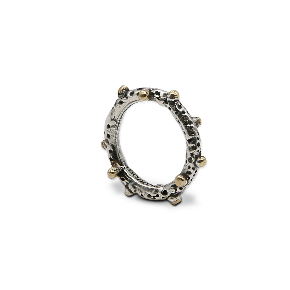L’anello fede unisex che appartiene alla collezione Galaxìas ha un design moderno ed accattivante. La rifinitura dell'argentoricorda i crateri lunari. I piccoli pallini in bronzo posizionati con una minuziosa tecnica artigianale creano un piacevole effetto cromatico. Un anello dedicato alla donna che ama indossare accessori dallo stile deciso e contemporaneo. Realizzato a mano in Italia.