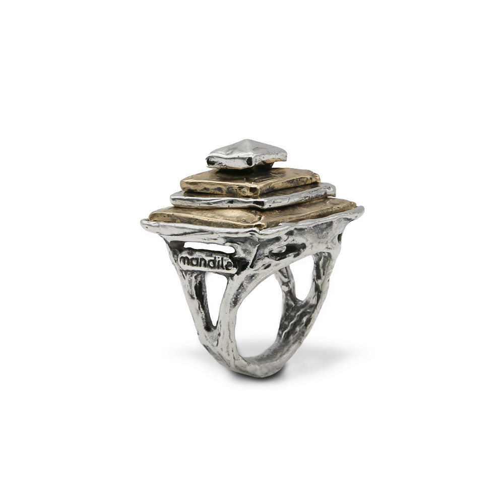 Una piramide a base quadrata sormonta il gambo dell'anello Quadrati .La piramide è formata da cinque ripiani quadrati semovibili, tre in argento e due in bronzo. Un anello dove le linee geometriche assumono tridimensionalità. Per la donna anticonformista con forte senso estetico contemporaneo. Realizzato a mano in Italia.