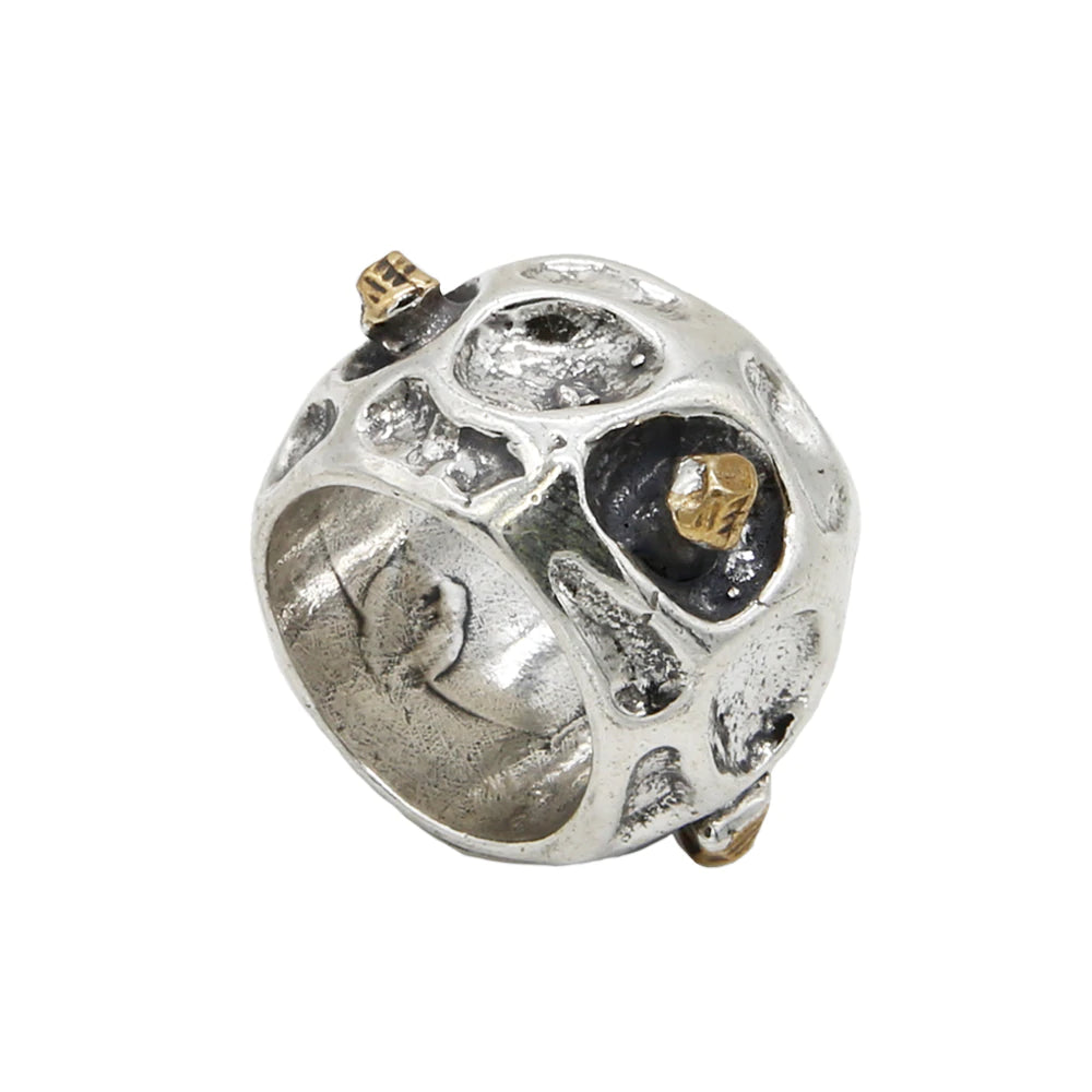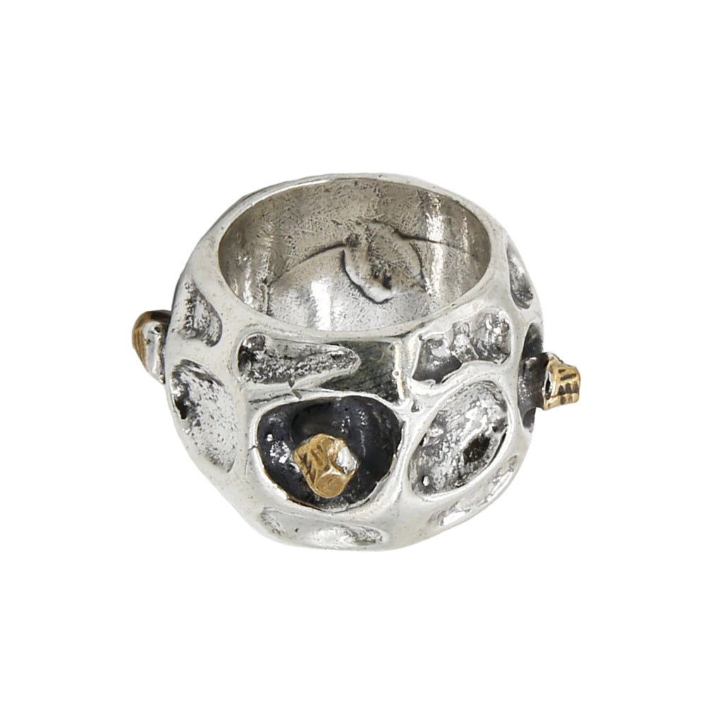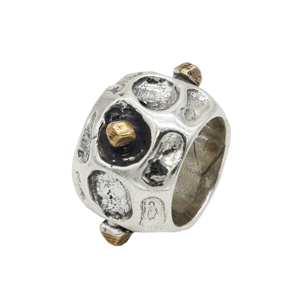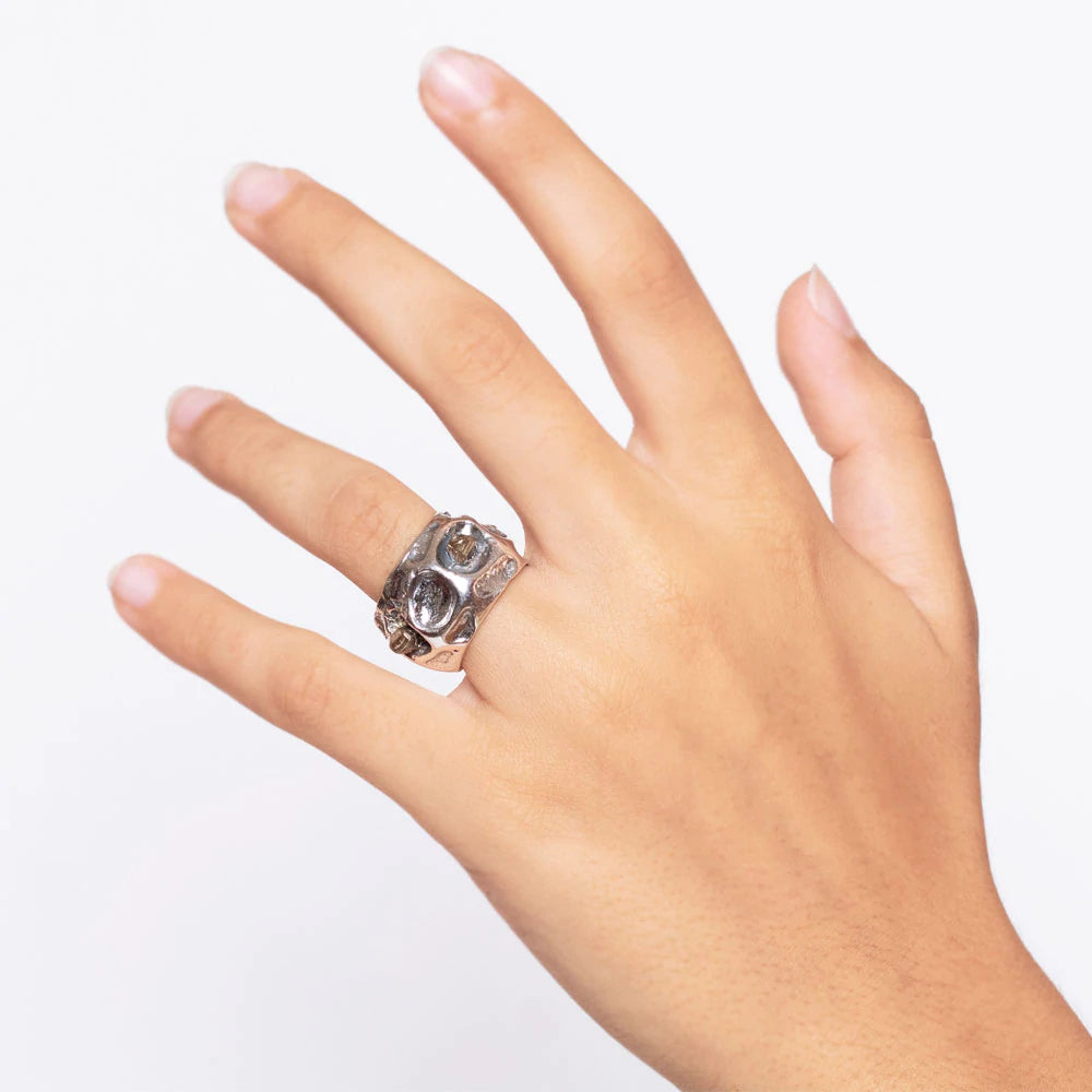 Anello a fascia in argento 925 e elemento in bronzo semovibile. L’argento e il bronzo sapientemente lavorati, diventano una fascia decisamene originale ed innovativa. La fascetta in bronzo semovibile che crea un piacevole contrasto cromatico, ha uno specifico alloggio e si inserisce in modo facile e veloce all’interno dell’anello in argento creando un tutt’uno.