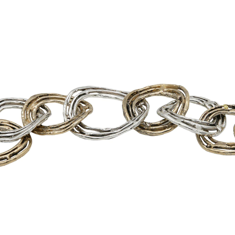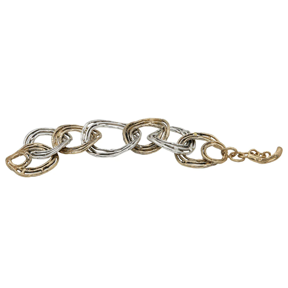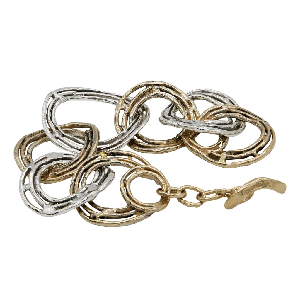 Bracciale snodato a maglie in argento 925 e bronzo. Chiusura regolabile T-BAR. Un intreccio di anelli dalla forma leggermente irregolare. Un bracciale dalla linea classica rivisitata in chiave contemporanea. Prezioso ed elegante accessorio per la donna che ama arricchire il proprio look con stile personale ed unico.