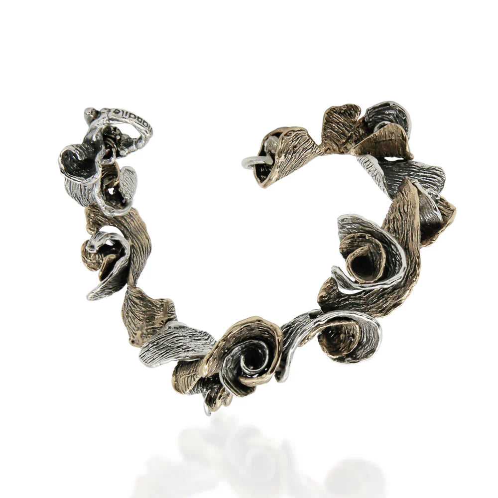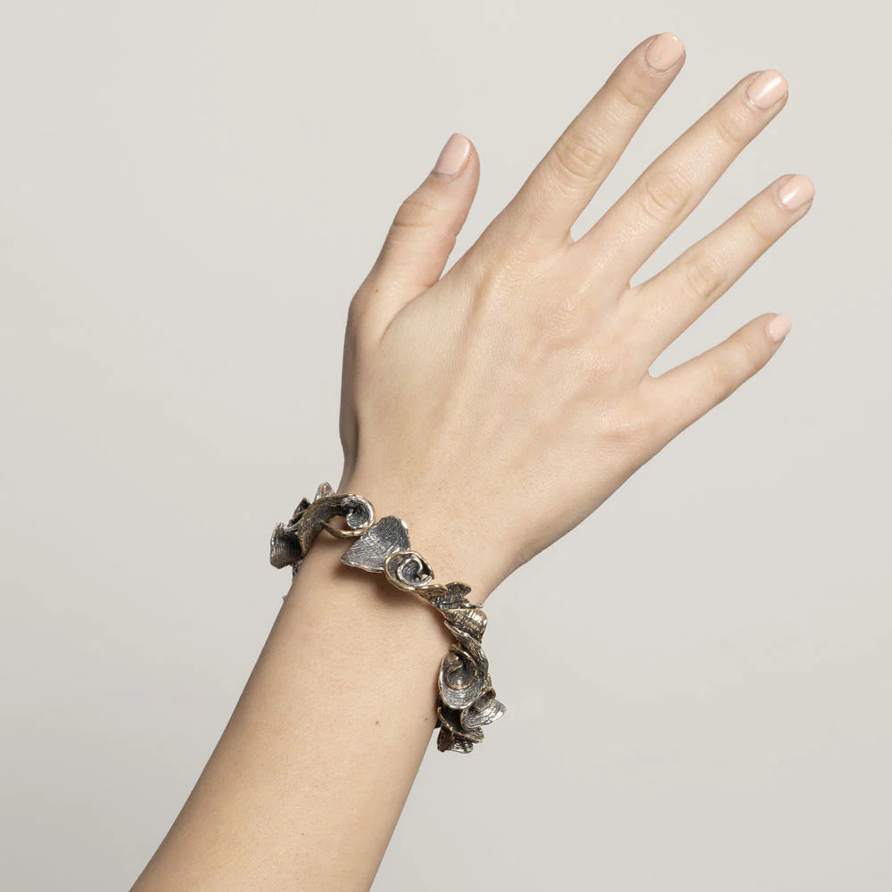 Il sensuale movimento della bellissima alga Pavonia è riportato nei vari elementi in argento e bronzo che compongono il bracciale snodato. I moduli del bracciale sono agganciati uno all'altro con un sistema che risulta praticamente invisibile. Un lavoro di maestria artigianale che permette al bracciale di snodare perfettamente sul polso e un indosso estremamente facile e confortevole. Chiusura artigianale gancio a moschettone. Dedicato alla donna dai gusti sofisticati che ama completare il proprio outfit con una nota di stile inconfondibile. Realizzato a mano in Italia.